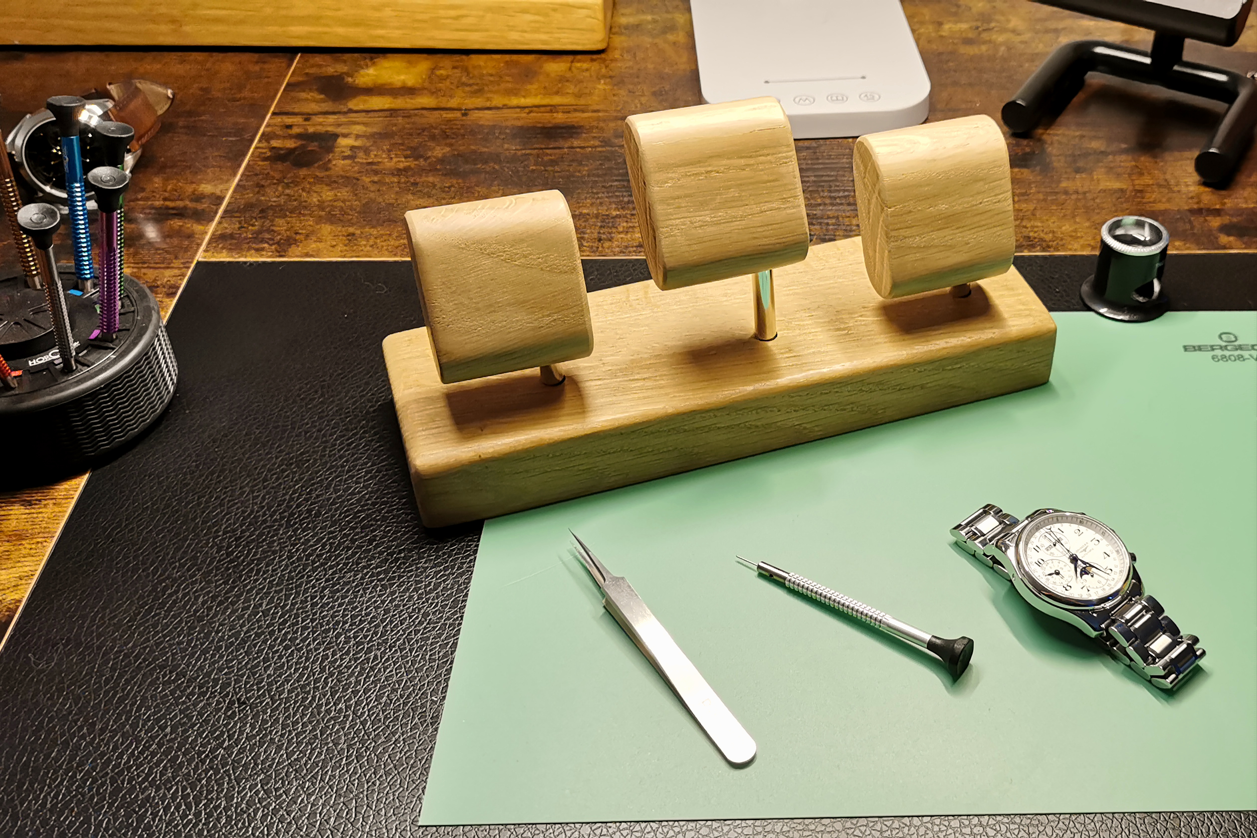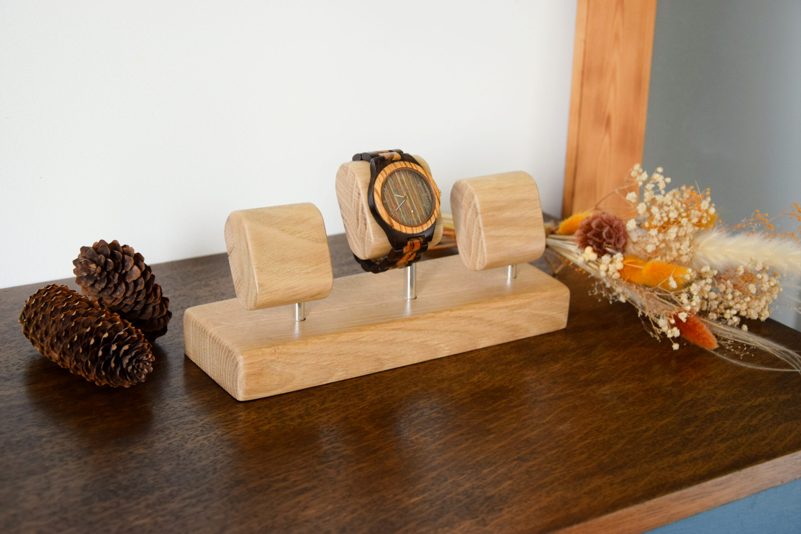 - Design pratique : chaque montre se positionne facilement en fermant son bracelet et en la glissant sur un des trois supports, garantissant ainsi une présentation sécurisée et élégante.